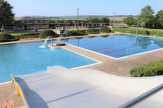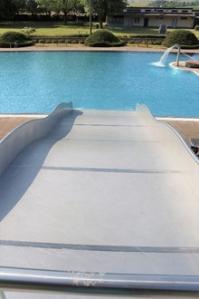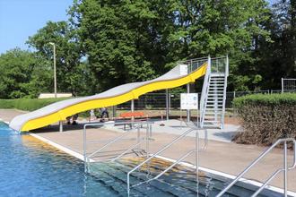 Die Rutsche steht und funktioniert! Sie passt sich wunderbar in das Badgelände ein.