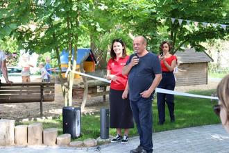 Ortsteilbürgermeister Ronny Schwanz eröffnet gemeinsam mit der Kitaleiterin Frau Zilian den neugestalteten Spielplatz.