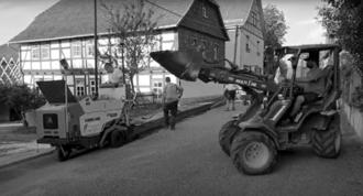 Firma Schneider Bau GmbH (Eisenach) beim Verschließen des Kabelgrabens mit dem Minifertiger in der Schloßstraße.
