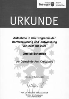 | - | 17. September 2020: Scherbda wurde zum zweiten Mal nach 1996 als Förderschwerpunkt der Thüringer Dorferneuerung anerkannt[9]. Den Auftrag für die Beratungsleistungen sowohl für die Kommune als auch für Privatpersonen erhielt die Stadtplanerin Ines Klinke aus Erfurt. |