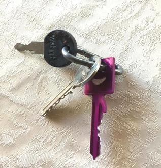 Vor kurzem wurde an der Sitzgruppe am Mühlwehr in Mihla ein Schlüsselbund gefunden. Ein Schlüssel ist violettfarben.