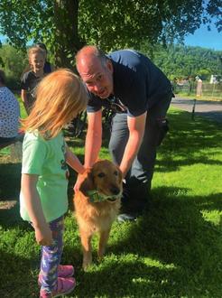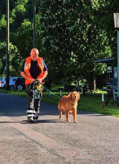 Besonders beeindruckend war die Vorführung der Rettungshundestaffel des DRK unter der Leitung von Olf Steinig. Er zeigte mit seinem Team, wie die ehrenamtliche Arbeit mit den Hunden beginnt und auf was in der Ausbildung sowohl für den Hundeführer als auch bei den Hunden geachtet werden muss. Die Hunde können nach erfolgreicher Ausbildung anhand des Geruches z. B. von Kleidung, Speichel oder Atem die Fährte der vermissten Person aufnehmen und diese über viele Kilometer hinweg finden. Olf Steinig hat zusammen mit der Hündin Anouk dieses Können vorgeführt und die Hündin konnte den „vermissten" Stadtbrandmeister in einer Menschengruppe finden. Für diese Leistung hat sich die Hündin ihre Belohnung mehr als verdient.