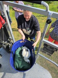 Im Korb der Drehleiter wurde dieses dann auf den Boden gebracht und wiederum von allen Zuschauern aufmerksam beobachtet und der Markierungsring mit der nun dem Storchenjungen eigenen Nummer angebracht. Dann ging es wieder hinauf ins Nest.