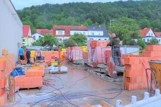 Die neuen Außenmauern sind bereits abgeschlossen, Ringanker und Dach werden vorbereitet und auch der Durchbruch zur alten Halle ist vorbereitet.