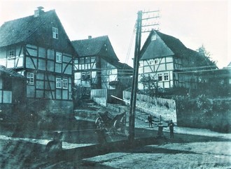 Im August 2024 stellte der Drogist Willi Thomas den Antrag an die Gemeinde, am Ausgang des „Honiggrabens“ zur Neustadtstraße hin eine mehrstöckige Drogerie mit Wohnungen zu errichten. Das Foto zeigt die Situation vor dem Bau des „Hochhauses“, wie es bald von den Mihlaern genannt wurde. Dieses Grundstück hieß damals „auf der Burg“, als Erinnerung daran, dass hier die alte Dorfbefestigung beinahe rechteckig vom westlichen Höhenzug des „Honiggrabens“ zur nördlichen Seite der Neustadtstraße abknickte und aufgrund der Höhenunterschiede eine burgartige Befestigung bildete.