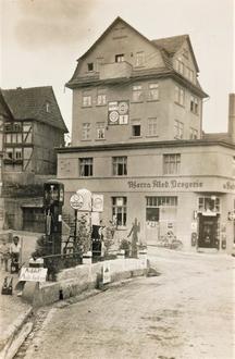 Blick auf das neue Drogeriegebäude von Willi Thomas und die erste Tankstelle, die ebenfalls vom Drogeristen betrieben wurde. Das Wohnhaus über der Drogerie wurde „auf der Mauer“ errichtet.