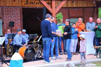 Die Einweihungsfeier der Köhlerbaude wurde genutzt, Dank zu sagen für die Umsetzung des Vorhabens. Hans Hermann Köhler und Dirk Mäurer wurden mit eigenen Bänken und angebrachten Namensschildern geehrt. Die Kinder von Lehrer Köhler bedankten sich bei den Mihlaern und allen, die an der Wiedererrichtung der Baude beteiligt waren. Ines Andrazcek erhielt schließlich ein Präsent für ihre herausragenden Leistungen bei der Umsetzung der Fördermaßnahme und als Landschaftsplanerin. Schließlich gab es noch eine Ehrung für Uwe Nowatzky, der vom Bauteam ein Gemälde der Köhlerbaude erhielt. Erinnert wurde an Thomas Berz, der schon in den 90er Jahren Planungen erarbeitet hatte.