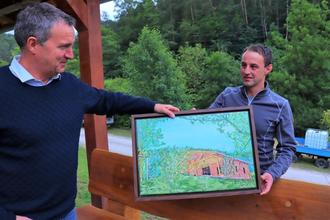 Alexander Vinz übergibt ein Gemälde der Köhlerbaude an Uwe Nowatzky.