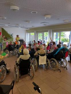 Nach einem herzlichen Empfang durch das Team des Hauses wurde unter Anleitung der Musiktherapeutinnen gemeinsam gesungen und musiziert. Verschiedene Instrumente kamen dabei zum Einsatz und schnell füllte sich der Raum mit lebendigen Klängen und fröhlichem Gesang. Die Kinder hatten mit viel Begeisterung eine kleine Aufführung vorbereitet, die bei den Seniorinnen und Senioren für große Freude sorgte. Zum Abschluss gab es für die Bewohnerinnen und Bewohner eine liebevoll vorbereitete, süße Überraschung der Kinder. Der Besuch war für alle Beteiligten ein gelungenes Beispiel für gelebtes Miteinander zwischen Jung und Alt.