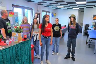 Jugendbetreuerin Anja Kropek von den Johannitern und einige der Jugendlichen des Clubs begrüßen die Gäste.