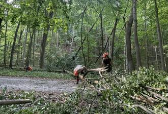 Das kann sowohl bedeuten, dass der gesamte Baum zu Boden gebracht werden muss, als auch, dass nur ein einzelner Totholzast oder ein lose in der Krone hängender Ast entfernt werden müssen. Dabei wird der Einsatz der Motorsäge soweit wie möglich vermieden. Wenn es der Baum, der Aufwand und die Unfallgefährdung zulassen, wird der betreffende Baum mit einer Winde zu Boden gebracht oder - wenn nötig - vom Weg gezogen. Der Grund: Auch nach diesen künstlichen Eingriffen soll das Waldbild so natürlich wie möglich aussehen.