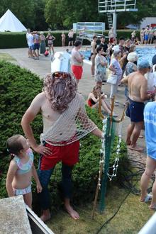 Der Nachmittag stand dann ganz im Zeichen der Familien. Das tolle Badewetter lockte weit über 200 Gäste an, die die feierliche Eröffnung der Rutsche, den Auftritt Neptuns mit seinem Gefolge, verschiedene Tanzgruppen des Mihlaer Carneval Vereins, und die von ihm vollzogene Taufe von Freiwilligen ebenso erleben konnten wie die Möglichkeit eines "Schnuppertauchens" oder den Auftritt einer Jugendgruppe der Eisenacher Synchron-schwimmerinnen.