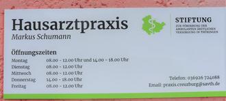 Am Eingang des Creuzburger Ärztehauses kündet die neue Tafel davon, dass hier wieder ein Allgemeinmediziner arbeitet.
