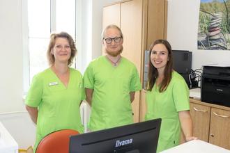 Allgemeinmediziner Markus Schumann mit seinem Team, Olivia Merten (links) und Janett Thomas.