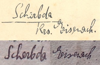 Schriftvergleich der Zeichnungsrückseite (oben) mit Eintragungen des Hilfspfarrers Wolfgang Rahaus im Scherbdaer Kirchenbuch (unten).