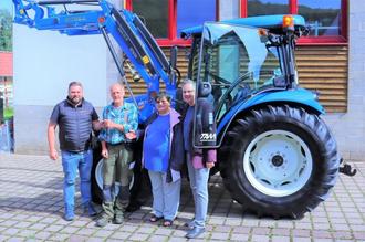 Schlüsselübergabe für den neuen Bauhoftraktor in Frankenroda. Links der Berater der Lieferfirma. Bauhofmitarbeiter Ronald Weber erhält den Schlüssel. Weiter mit dabei Ortsteilbürgermeisterin Erika Helbig und Bürgermeister Rainer Lämmerhirt.