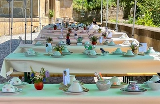 Die Kaffeetafel braucht besonders viele Helfer und Helferinnen. Großen Dank allen, die dafür den Kuchen gespendet haben, den Transport, die Bewirtung und den Schmuck organisieren und am Sonntag nach dem Aufwasch wie bei einem Puzzle die Sammeltassen sortieren.