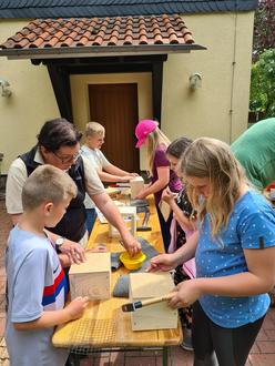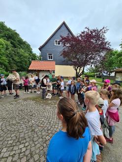 Am 20. Juni 2023 fuhren die dritte und vierte Klasse unserer Schule mit einem Sonderbus nach Fürstenhagen. Wir besuchten hier erstmals das Naturparkzentrum Eichsfeld-Hainich-Werratal. Im Erlebnis- und Verwaltungszentrum des Naturparks wurden wir sehr herzlich von der Mitarbeiterin Elka Komitova in Empfang genommen. Sie erklärte uns anschaulich die Welt der Wildbienen. Wir lernten einige bedeutsame Wildbienenarten und ihre Lebensweise kennen. Außerdem erfuhren wir, wie wir zu ihrem Schutz beitragen können. Im Anschluss durften wir selbst Hand anlegen und ein eigenes Insektenhotel aus Holz für den Garten bauen. So konnten wir einen aktiven Beitrag zum Insektenschutz leisten. Beim Hämmern, Tackern und Befüllen des Insektenhotels wurden die Kinder auch von Ronny Kothe unterstützt. Dieser war gerne mitgekommen, um den Kindern beim Bauen zu helfen. Dafür an dieser Stelle noch einmal unser herzlicher Dank. Wir hatten auch Zeit, den Wald-Erlebnispfad zu erkunden. Nachdem wir ein kleines Natur-Rätsel gelöst hatten, gelangten wir zu einem riesigen Baumhaus, welches wir erklimmen durften. Zum Abschluss besuchten wir noch die Ausstellung „Mach`s nachhaltig“ im Wasserturm, in dem wir noch einiges Wissenswertes zum Naturpark mitnehmen konnten. Bevor wir die Heimreise antraten, verabschiedete uns Frau Komitova und übergab jedem Schüler einen Forscherrucksack mit Wildbienenheft, Bienenmaske und Entdeckerbuch. Jeder durfte natürlich auch sein selbstgebautes Insektenhotel mit nach Hause nehmen. Für diesen erlebnisreichen Tag und die Materialien bedanken wir uns ganz herzlich beim Team des Naturparks Eichfeld-Hainich-Werratal, insbesondere bei der Leiterin Claudia Wilhelm, für die Organisation des Projekts und die gute Zusammenarbeit in diesem Schuljahr.