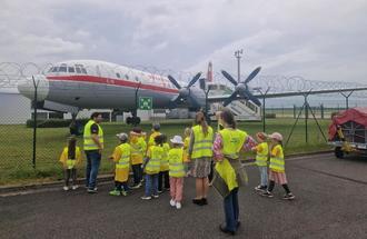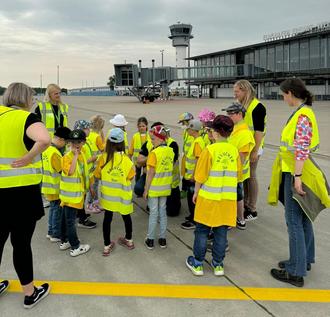 Pünktlich kommen wir in Erfurt an und steigen direkt vom Zug in die Straßenbahn, bis zum Anger, dort werden die Figuren der Maus und des Elefanten von der Sendung mit der Maus besucht und dann geht’s auch schon mit der nächsten Straßenbahn weiter. Angekommen am Flughafen bekommt jedes Kind eine Warnweste und einen Besucherausweis und dann müssen wir durch die Sicherheitskontrolle. Sogar unsere Rucksäcke werden überprüft, wie bei einem richtigen Flug.