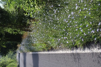 Die Wegwarte blüht unbehindert an den Straßen, wie hier an der K 5 zwischen Ebenshausen und Frankenroda. Die Leitpfosten sind kaum noch zu erkennen