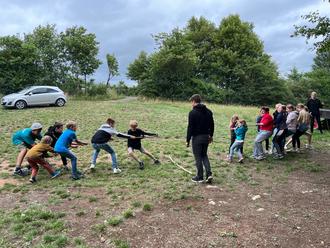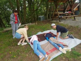 Nach einer Verschnaufpause absolvierten die drei Gruppen mit ihren Betreuern, die Parcours und Aufgaben. Dazu gehörten z. B. was gehört in eine Sanitasche, wie setze ich einen Notruf ab, was für Wunden gibt es und wie versorge ich diese, wann und wie führe ich eine stabile Seitenlage durch, wie helfe ich bei einem Kreislaufstillstand und das Erkennen von Giftpflanzen.