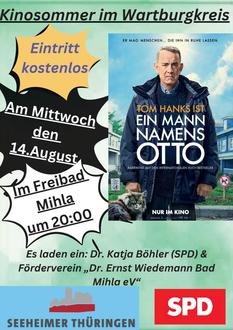 Am Mittwoch, den 14. August 2024 um 20:00 Uhr laden Dr. Katja Böhler (SPD) und der Freibad Mihla e.V. zur Filmvorstellung ins Mihlaer Freibad ein. Auf Wunsch von Mihlaern wird der Film „Ein Mann namens Otto" von Marc Forster gezeigt. Der Film kam 2023 ins deutsche Kino.