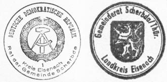 | - | Sommer 1990: Das Siegel der Gemeinde Scherbda mit Hammer, Zirkel und Ährenkranz wurde außer Dienst genommen. Die Abgeordneten einigten sich darauf, künftig den Thüringer Löwen im Siegel zu führen[10]. |