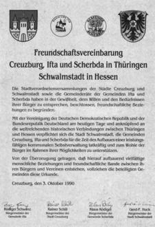 | - | 3. Oktober 1990: Am Tage des Beitrittes der Deutschen Demokratischen Republik zur Bundesrepublik Deutschland wurde in Creuzburg zwischen den Orten Schwalmstadt (Hessen) sowie Creuzburg, Ifta und Scherbda (Thüringen) eine Freundschaftsvereinbarung getroffen[15]. Der Schwalmstädter Bildhauer Lutz Lesch fertigte dazu im Auftrag der Stadt Schwalmstadt in vierfacher Ausführung eine 24 cm x 34 cm große und ca. 5 kg schwere Bronzetafel mit der Aufschrift: „3. Oktober 1990 Zum Tag der Deutschen Einheit Freundschaft zwischen Creuzburg Ifta Scherbda Schwalmstadt“ an[16]. |