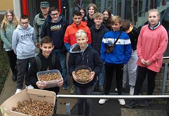 Büttner, der seit vielen Jahren eine enge Verbindung zur Regelschule Mihla pflegt, freute sich sehr darüber, mehrere Kartons voller Eicheln in Empfang nehmen zu können. Allerdings konnte er sie nicht als Saatgut weitergeben, da die gesammelten Eicheln nicht aus einem zertifizierten Forstbestand kommen. Einen solchen betreut Förster Michael Kappauf im Revier Mihla, dorthin könnte eine Exkursion im nächsten Herbst gehen, um den Schülern alte wertvolle Eichenbestände zu zeigen. Unabhängig davon begeisterte er die Schüler mit viel Wissenswertem rund um den Wald und seine Flora und Fauna. Der Förster hatte auch gut zu tun, die vielen Fragen zu beantworten, so etwa zum Unterschied zwischen Stiel- und Traubeneiche, zu Kreisläufen der Natur, zum naturnahen Waldumbau und welche Arten dem Klimawandel in unseren Breiten am besten trotzen können und welche für unsere Heimat auch im wirtschaftlichen Sinne besonders wichtig sind.