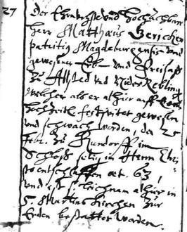 Das Ableben auf Schloß Kühndorf (eine ehem. Johanniterkomturei) veranlasste uns, auch in den dortigen Kirchenverzeichnissen nach Sterbeeinträgen zu suchen: Im Kasualienregister Kühndorf 1607-1649 (Mikrofilm-Nr. 7913, Band-Nr. 275/1), das Taufen, Communikanten, Trauungen und Sterbedaten für jedes Jahr gemeinsam auflistet, hat sich im Jahr 1624 - wie aber zu erwarten war - kein Eintrag für M. Gericke gefunden. Ich danke sehr herzlich Frau Lena Koch vom Landeskirchenarchiv Magdeburg für die Einsicht in die Mikroverfilmung der Kirchenbücher des Kirchenkreises Henneberger Land.