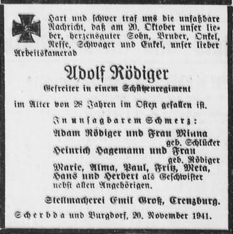 Adam Rödiger lebte hier mit seiner zweiten Ehefrau Minna, geb. Schlücker (*20.10.1890) und den Kindern Adolf (*12.07.1913, aus erster Ehe, 1941 in Südrussland gefallen), Erna (*24.12.1915, aus erster Ehe, später in Burgdorf bei Salzgitter), Bernhardine Marie (*27.09.1922), Alma (*29.08.1923), Paul (*13.01.1926), Fritz (*02.05.1927), Meta (*22.06.1928), Hans (*21.03.1931) und Herbert (*08.09.1933).