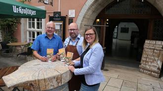 Nationalparkleiter Manfred Großmann (l.), Gastronom Martin Braun von der „Ratswaage“ und Geschäftsstellenleiterin des regionalen Dachverbandes Welterberegion Wartburg Hainich e.V., Anne-Katrin Ibarra Wong, präsentieren gemeinsam die druckfrische Broschüre „Nationalpark-Partner: Naturverbunden und nachhaltig“.