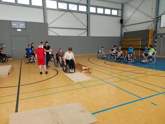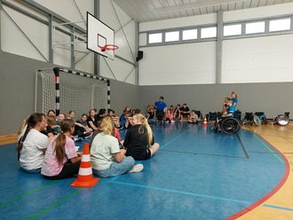 Aus einer ganz anderen Perspektive erleben die Regelschüler, mit welchen Hindernissen Versehrte täglich kämpfen müssen. Im Krankenfahrstuhl bewältigt jeder Schüler selbst verschiedene starke Unebenheiten, Wippen und Untergründe, die auf den ersten Blick leicht zu bewältigen scheinen, sich als Rollstuhlfahrer dann doch kniffliger erweisen. „Die Kooperation geht weiter - in den nächsten sechs Jahren werden wir 60 Schulen besuchen“, so Stephanie Robus. An den beiden anderen Stationen nehmen die Schüler ebenfalls im Rollstuhl Platz und spüren, wie es sich anfühlt, im Sitzen Rugby und Basketball zu spielen. Marcel Schmidt leitet die Jugendlichen im Rugby und Max Dietrich im Basketball an.