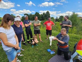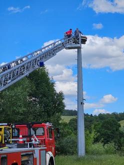 Der kleine Storch im Storchennest an der Mühlspitze war Anfang Juli so groß geworden, dass mit Juliane Balmer von der Vogelschutzwarte in Seebach ein Termin vereinbart werden konnte, um ihn zu beringen. Die Freiwillige Feuerwehr Mihla wurde wieder um Unterstützung gebeten, denn ohne die Drehleiter würde man nicht an das Nest herankommen.