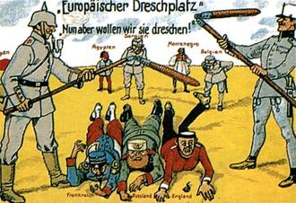 Europäischer Dreschplatz “Nun aber wollen wir sie dreschen!“ "Japan - Ägypten - Serbien - Montenegro - Belgien - Frankreich - Russland - England“ Diese Postkarte wurde im August 1914 von vielen Mihlaern an Angehörige geschickt, die gerade zum Kriegsdienst einberufen worden waren ... echt deutsche Bescheidenheit!