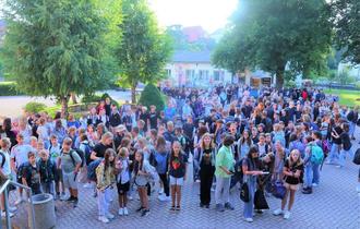 Kurz vor der Eröffnung des neuen Schuljahres-Blick auf die versammelte Schülergemeinde auf dem Mihlaer Schulhof.