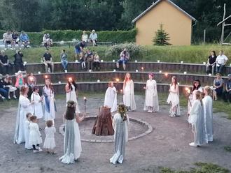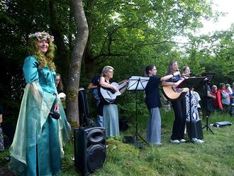 Groß und Klein zogen dann mit der von Olivia Merten angeführten Elfenschar zur Feuerarena der Jugendherberge „Urwald-Life-Camp“. Dort entfachten sie das Mittsommerfeuer und es wurde zum Lied „Kein schöner Land in dieser Zeit“ um das Feuer getanzt.