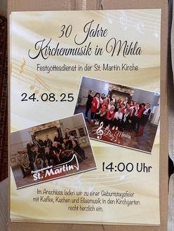 | 14.00 | Kirche Mihla, Gottesdienst „30 Jahre Chor „Pro Musica“ und Posaunenchor St. Martin“ |
