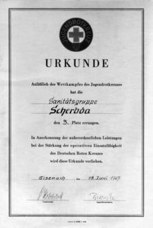 | - | 18. Juni 1967: Anlässlich eines Wettkampfes des „Jugendrotkreuzes“ errang die Sanitätsgruppe Scherbda einen 3. Platz auf Kreisebene[6]. |