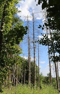 Am hinteren Harsberg kann man das sterben der letzten Fichten durch Borkenkäfer, Trockenheit und Windbruch erleben