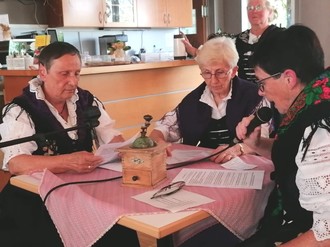 Doris Lange erklärt die Mihlaer Tracht, die Ramona König präsentiert. Mit dabei Frau Beate Büttner.