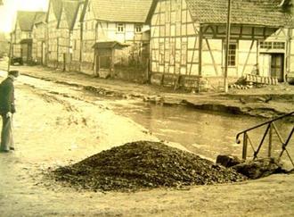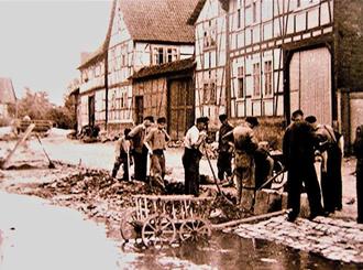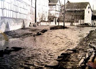 Auf den Fotos sind Bauarbeiten zu erkennen, durch die große Steine als Begrenzung für den Wasserlauf gesetzt wurden. Diese Konstruktion war bis zum Hochwasser der 70er Jahre noch vorhanden und wurde dann durch die Betonplatten in einem wesentlich vertieften Flusslauf ersetzt.