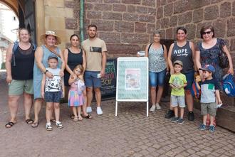 Nach einem beschwerlichen Aufstieg zur Burg bei tropischen Temperaturen starteten die Führungen für Groß und Klein im Burghof unter der Leitung von Frau Hilbert. Sie erzählte uns die Geschichte von Ludwig dem Springer, wie dieser Eigentümer der „Warte Burg“ wurde. Der kniende Löwe auf dem Dach ehrte das Brautpaar Ludwig und Elisabeth zu ihrer Vermählung. Nun ging es ins Innere der Burg, erst besichtigten wir ein Kinderzimmer und dann den Speisesaal. Dort konnten alle das Wandgemälde mit den verschiedenen Fabeltieren betrachten, das ist wohl der Fernseher aus dieser Zeit gewesen. Viele Geschichten rund um Löwen, Hirsche und sogar ein Einhorn sind aus den Bilder heraus erzählt worden. Auch eine mittelalterliche steinerne Toilette mit „Toilettenpapier aus Moos“ ließ uns staunen. Die Kinder probierten sich im Sängersaal mal als Minnesänger aus und standen auf der Bühne zum Sängerwettstreit bereit. Begleitet durch mittelalterlicher Musik gab es im Festsaal der Wartburg die Möglichkeit mal einen echten Ritterhelm oder ein Burgfräuleinkleid zu probieren. Zum Abschluss erhaschten wir noch einen Blick in die Schreibstube von Martin Luther, dort wo er die Bibel übersetzt hat.