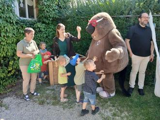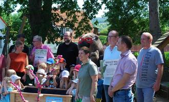 Woody war bei den Kindern der Renner. Der Biber ist das Maskottchen der Creuzburger Firma Pollmeier und ist der Liebling der Kinder. Vor allem dann, wenn er so gut gespielt wird, wie während der Übergabe von drei Hochbeeten an die Kitas der Stadt.