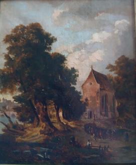 Es zeigt eine Szene vor der Liboriuskapelle in Creuzburg. Das Gemälde erinnert sehr stark an das bekannte Bild von Ernst Christian Johann Friedrich Preller d. Ä. (1804-1878), der 1840 eine Prozession zur Liboriuskapelle malte.