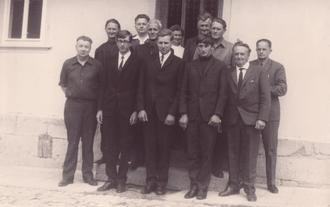 Gruppenbild am „Rat der Gemeinde“ anlässlich der Übergabe der Meisterbriefe. Vorne v.l.: Bürgermeister Walter Weber, Robert Salzmann, Herbert Moseberg, Siegfried Rödiger, Hellmut Gernandt. Hinten v.l.: Alfred Rödiger, Kollege Wuth von der VHS Eisenach, Walter Hagedorn, Hilde Schlücker, Willi Kleinsteuber, Artur Eichholz, Hermann Sachs[11]