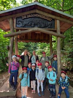 Nachdem alle gestärkt waren, ging es mit dem Stadtbus weiter zur Hohen Sonne. Von dort aus begann das eigentliche Abenteuer: der Weg durch die Drachenschlucht. Die „Hainichräuber“ hatten ein ganz besonderes Ziel vor Augen: Sie wollten den kleinen Drachen „Emil“ aus dem beliebten Buch von Michael Kirchschlager finden.