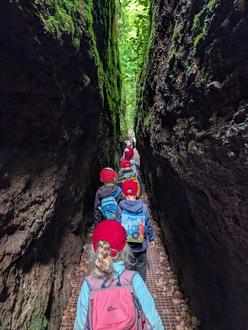 Die Wanderung durch die enge und geheimnisvolle Schlucht war für die Kinder ein unvergessliches Erlebnis. Sie navigierten geschickt über glitschige Wege, quetschten sich durch enge Felsspalten und bestaunten die moosbewachsenen Felswände. Überall plätscherte Wasser, was die Geräuschkulisse der Schlucht noch magischer machte.