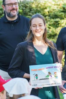 Staatssekretärin Tina Rudolph vom Thüringer Ministerium für Soziales, Gesundheit, Arbeit und Familie wünscht den "Kleinen Händen" eine "Grosse Ernte", in der Hand die Förderplakette.