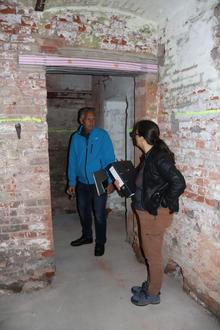 Die leitende Architektin Angela Leinhos im Gespräch mit dem Fachplaner Herrn Ulrich im Keller des Gebäudes.